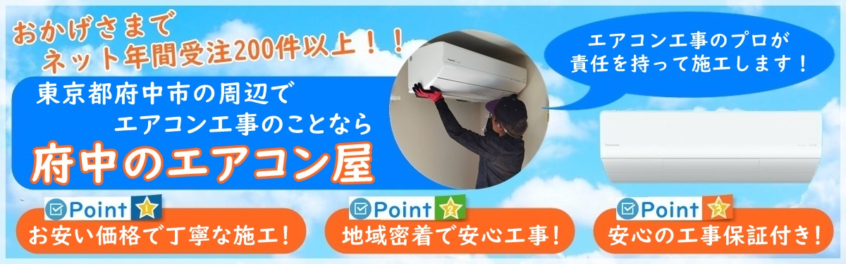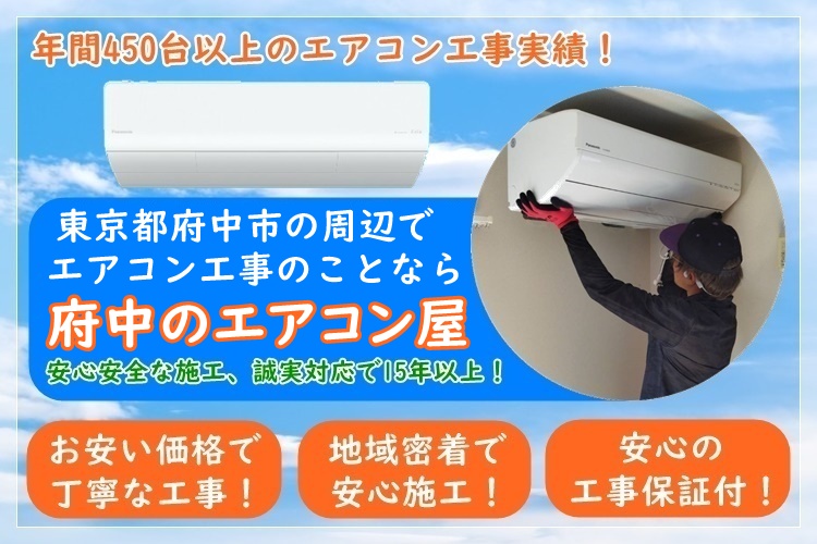 府中のエアコン屋は家庭用のエアコン工事を主にエアコン取り付け・取り外し工事をおこなっている地域密着のエアコン業者で、府中市を中心に東京都で活動しております。